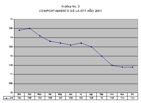 Durante el año 2001 la tasa interbancaria presentó una tendencia a la baja como consecuencia en la reducción en las tasas de intervención del Banco de la República, como ocurrió "Al finalizar el año, cuando la tasa promedio se sitúo en el 8.4% el menor valor observado desde principios del año 2000" [2] , esta situación repercutió en las tasas de negociación de documentos transados por las entidades del Distrito que presentaron portafolio de inversiones, al negociarse títulos con tasas de mercado que estuvieron atadas al comportamiento de la tasa de referencia DTF, la cual finalizó en 11.4% es decir 0.6% por debajo de la cifra mostrada en septiembre, el 1.2% con respecto a junio, el 1.7% con respecto a marzo y del 2% con respecto a enero.