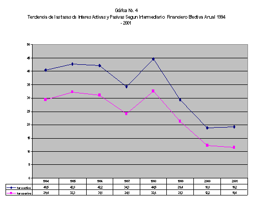 Dicho comportamiento incidió notablemente en el margen de intermediación financiera que se vio aumentado debido a que se produjo un costo agregado de los recursos del crédito –incrementando las tasas de colocación o activas-, situación que no se dio con las tasas pasivas o de captación ofrecidas por el sistema financiero, lo que hubiese permitido reactivar el mercado primario como secundario de documentos transados en el mercado bursátil del país. Afirmación corroborada con la disminución presentada en este mercado por parte de los inversionistas, dados los bajos rendimientos generados en términos reales.