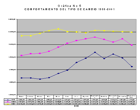 Durante el último año, la suerte del dólar estuvo determinada en buena parte por el comportamiento de los recursos monetarios nacionales, en materia de desembolsos de dinero y colocación de documentos en el mercado como estrategia de prefinanciación del gasto adoptado por el Gobierno; sin embargo, no se otorgó a la economía recursos suficientes que dinamizaran los medios de pago; pese a lo anterior, la implantación de medidas restrictivas causaron un efecto de disminución del circulante que se tradujo en el comportamiento del precio del dólar para determinar el tipo de cambio y permitir su estabilidad, como se observa en la gráfica No 5, presentándose variaciones significativas principalmente durante el segundo semestre del año. "Así, a 31 de diciembre la tasa de cambio real cerró en $2.291.18, lo que correspondió a una devaluación anual al cierre del año del 2.8%, por debajo de las expectativas del mercado" [3]