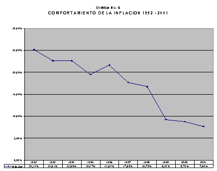 La inflación al finalizar el año 2001 fue del 7.65%, inferior en 0.35 puntos porcentuales a la meta fijada del 8% por el Gobierno Nacional, y en 1.1 puntos porcentuales al observado en diciembre de 2000. Este nivel de inflación anual alcanzado en 2001, es el más bajo logrado para cualquier mes desde diciembre de 1999 cuando se ubicó en 9.2%. Ver gráfica No 6.
