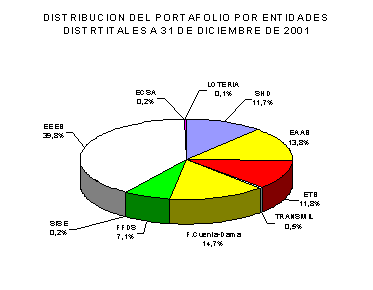 La Empresa de Energía de Bogotá mantiene un portafolio de $427.708 millones que equivalen al 39.7% del total del portafolio del Distrito a 31 de diciembre de 2001 y que está representado en su mayor parte por bonos ($172.530 millones) y Time deposits ($151.693 millones).